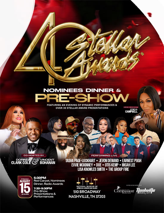 The 40th Stellar Gospel Music Awards – Gospel Music’s Greatest Night – gets even GREATER! Today, Central City Productions announced that Dorinda Clark-Cole and Vincent Bohanan will host the Stellar Nominee Pre-Show Dinner and Awards at the National Museum of African American Music in Nashville on Friday, August 15th. This exclusive, invitation-only event is open to all 2025 Stellar Award nominees. Preceding the nominee dinner, Lonnie Hunter, will host the annual Radio Awards. Friday night’s celebration will include a red-carpet hosted by Rizzo and Meta Washington. The 40th Stellar Awards Nominee Dinner and Pre-Show will premiere on the Stellar TV Network at a date later to be announced.