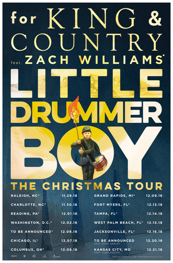 Two-time GRAMMY® Award winners for KING & COUNTRY will hit the road in December with their Christmas tour extravaganza Little Drummer Boy | The Christmas Tour, presented by Compassion. The nationwide trek kicks off on 11/29 in Raleigh, NC, and will be heading to major markets such as Washington D.C. (EagleBank Arena), Chicago (Willow Creek), and Tampa (Amalie Arena). Joining the duo on tour is special guest Zach Williams, and rising star Cory Asbury (performing on the last two dates). Pre-sale begins August 15th at 10:00am (local time) and ends August 16th at 10:00pm (local time). Users can access the pre-sale by entering the code “joy” HERE.