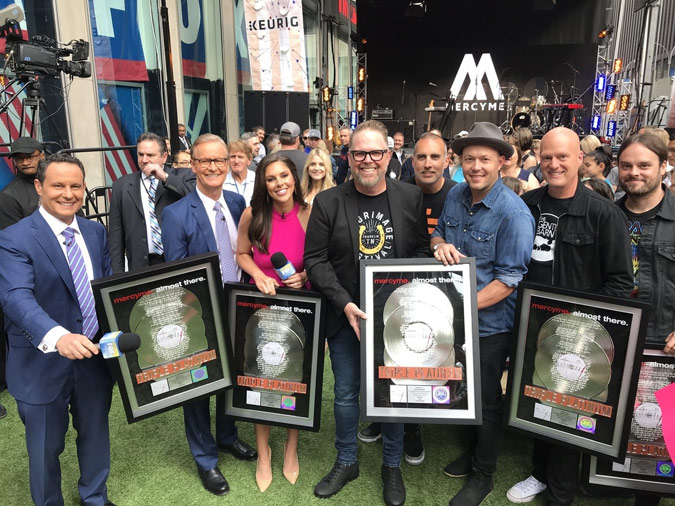MercyMe took center stage at Friday’s FOX & Friends’ All-American Summer Concert Series. Amidst the live performances, the 5X GRAMMY® nominees were surprised by hosts Brian Kilmeade, Steve Doocy and Abby Huntsman with RIAA certified triple platinum (3 million albums sold) plaques for their landmark album Almost There. The morning show appearance timed with the Jun. 12 blue-ray and DVD release of the blockbuster movie I Can Only Imagine, which is available digitally now.