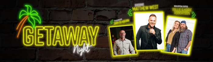 Matthew West is at the helm of a couples-focused “Getaway Night” this fall with special guests Willie and Korie Robertson of the television hit “Duck Dynasty” and Winning At Home’s Dan Seaborn. The unique offering presented by Premier Productions will serve as a night of relaxing and encouraging fun for couples. “Getaway Night” will hit 16 cities this fall, giving married couples a night off to laugh, engage and grow together as a couple without distractions.