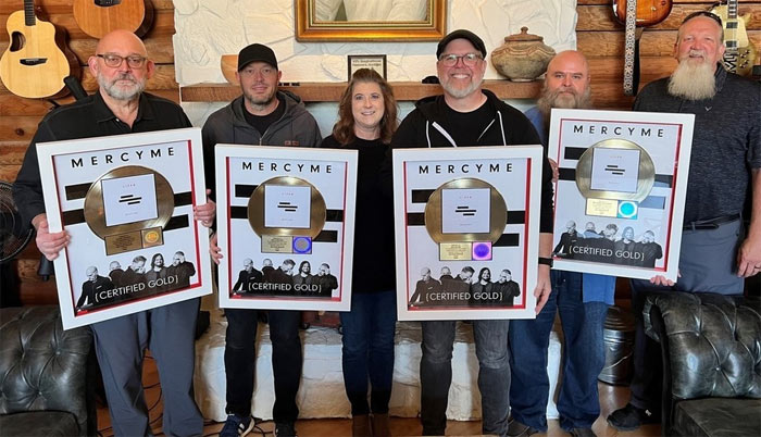 Multi-platinum, award-winning band MercyMe is celebrating the RIAA Gold Certification of their 2017 album LIFER. Fair Trade Services’ Founder/President Jeff Moseley and Senior VP of Marketing & Promo Dan Michaels, along with Scott Brickell and Kim Davis from the band’s management, BrickHouse Entertainment, recently presented commemorative plaques to band members Bart Millard and Mike Scheuchzer at their studio outside Nashville. This is MercyMe’s seventh RIAA Certified Gold album, joining 6 previous Gold Certifications and one Triple Platinum Certification. To note, all three singles from Lifer (“Even If,” “Grace Got You,” and “Best News Ever”) hit #1 on Billboard National Christian Audience, AC Monitored, and AC Indicator charts.