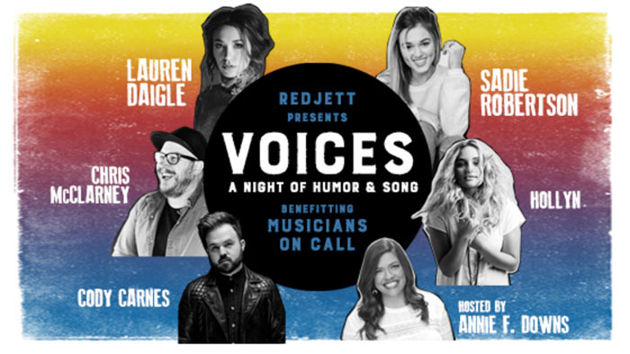 Redjett Management announces a special evening of songs and stories that will benefit Musicians On Call on August 02, 2018 at the historic Franklin Theatre. Redjett’s family of artists – Lauren Daigle, Sadie Robertson, Chris McClarney, Cody Carnes and Hollyn – will lend their time and talent to showcase the healing power of music. “VOICES: AN EVENING OF HUMOR AND SONG” will be hosted by author and speaker Annie F. Downs and include unique collaborations, individual performances and plenty of laughs creating a one-of-a-kind event.
