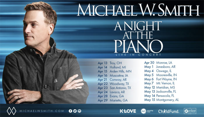 The Awakening Foundation and Awakening Events are excited toannounce Michael W. Smith’s “A Night at the Piano: Live In Concert” tour. Multi-platinum singer and songwriter Smith will headline the highly-anticipated tour, kicking off April 13 and running through May 15, hitting 20 markets such as Minneapolis (Arden Hills), Chicago (Oswego), San Antonio, and Jacksonville, FL.