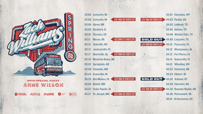 The Awakening Foundation and Awakening Events announces that tickets for multi-award-winning and top-selling artist Zach Williams’ Spring Tour 2022 are on sale now. The 35-city tour kicks off on March 2nd and will run through May 1 and will feature special guest Anne Wilson (“My Jesus,” “Sunday Sermon”). Click here or on the tour poster above for tickets.