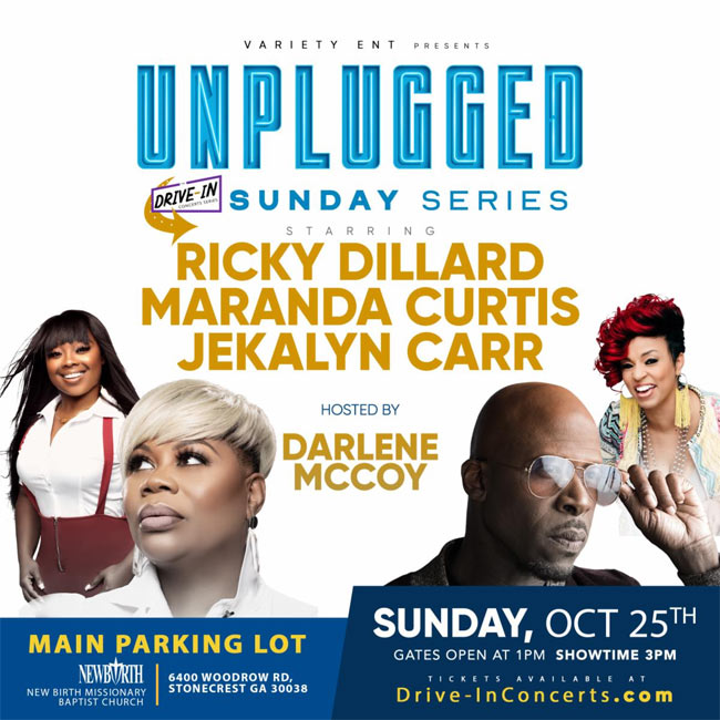 On behalf of Variety Entertainment, you’re invited to the Unplugged Sunday Series – an amazing celebration of Gospel Music with Ricky Dillard, Maranda Curtis, & Jekalyn Carr. Award winning TV/Radio personality Darlene McCoy is hosting the night of music you don’t want to miss.